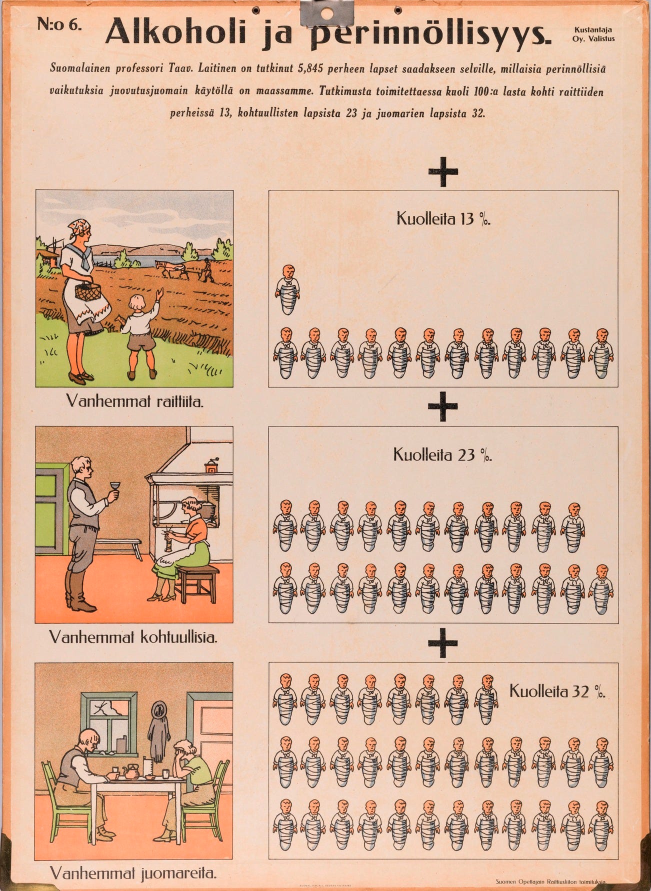 No. 6. Alcohol and heredity. Finnish Professor Laitinen has studied the children of 5,845 families to determine what kind of hereditary effects the use of intoxicating beverages has in our country. At the time the study was conducted, for every 100 children, 13 died in teetotal families, 23 among the children of moderate drinkers, and 32 among the children of drunkards. First row: Teetotal families. Second row: Moderate drinkers. Third row: Drunkard families.
