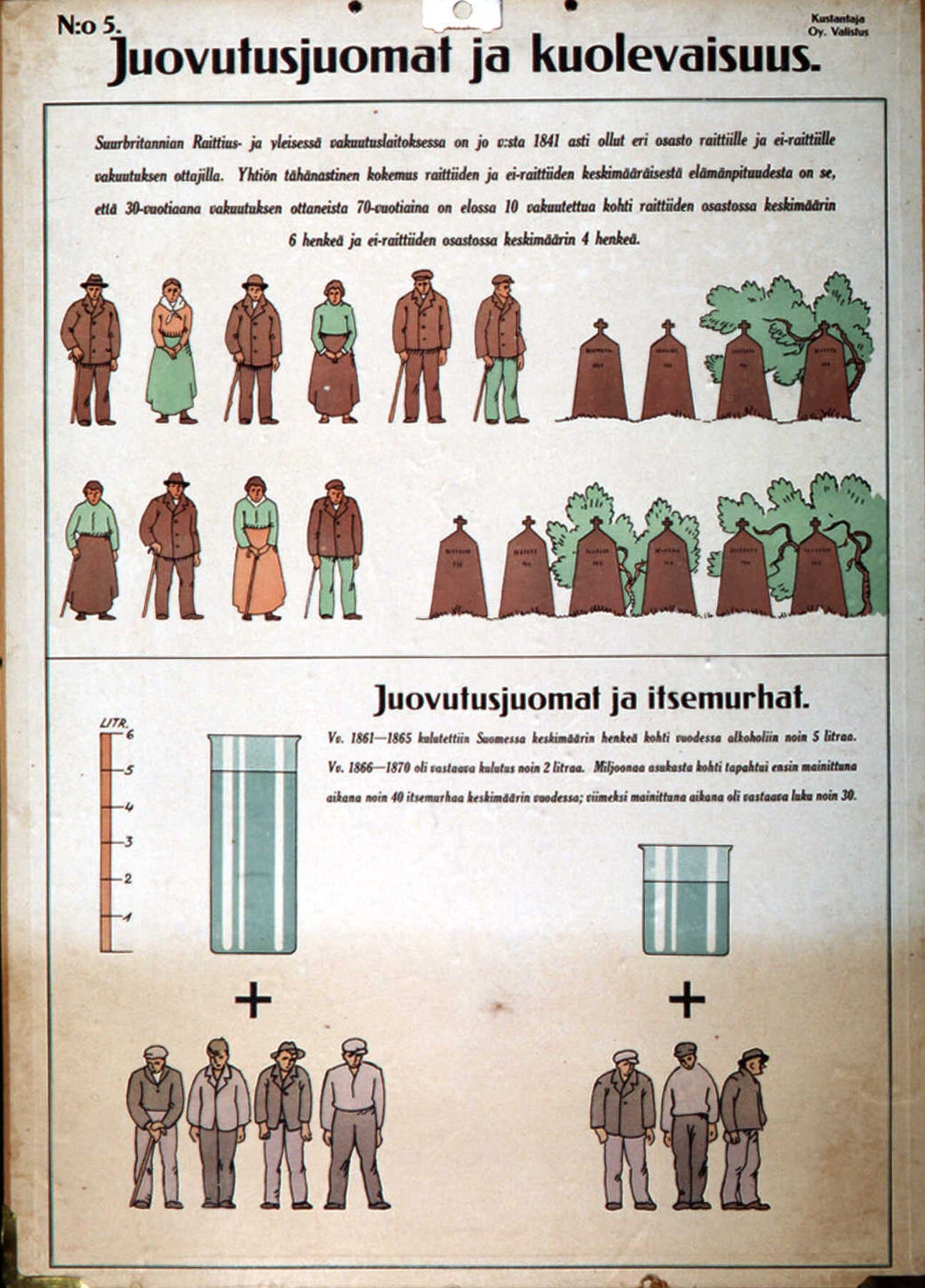 No. 5. Intoxicating beverages and mortality. In Great Britain's Temperance and General Insurance Institution, there has been, since the year 1841, a separate department for teetotal (sober) and non-teetotal policyholders. The company's experience so far regarding the average life expectancy of the sober versus the non-sober is that, out of 10 insured persons who took out insurance at age 30, 6 people were alive at age 70 in the teetotal department on average, and 4 people in the non-teetotal department on average. Image courtesy of Helsinki City Museum.