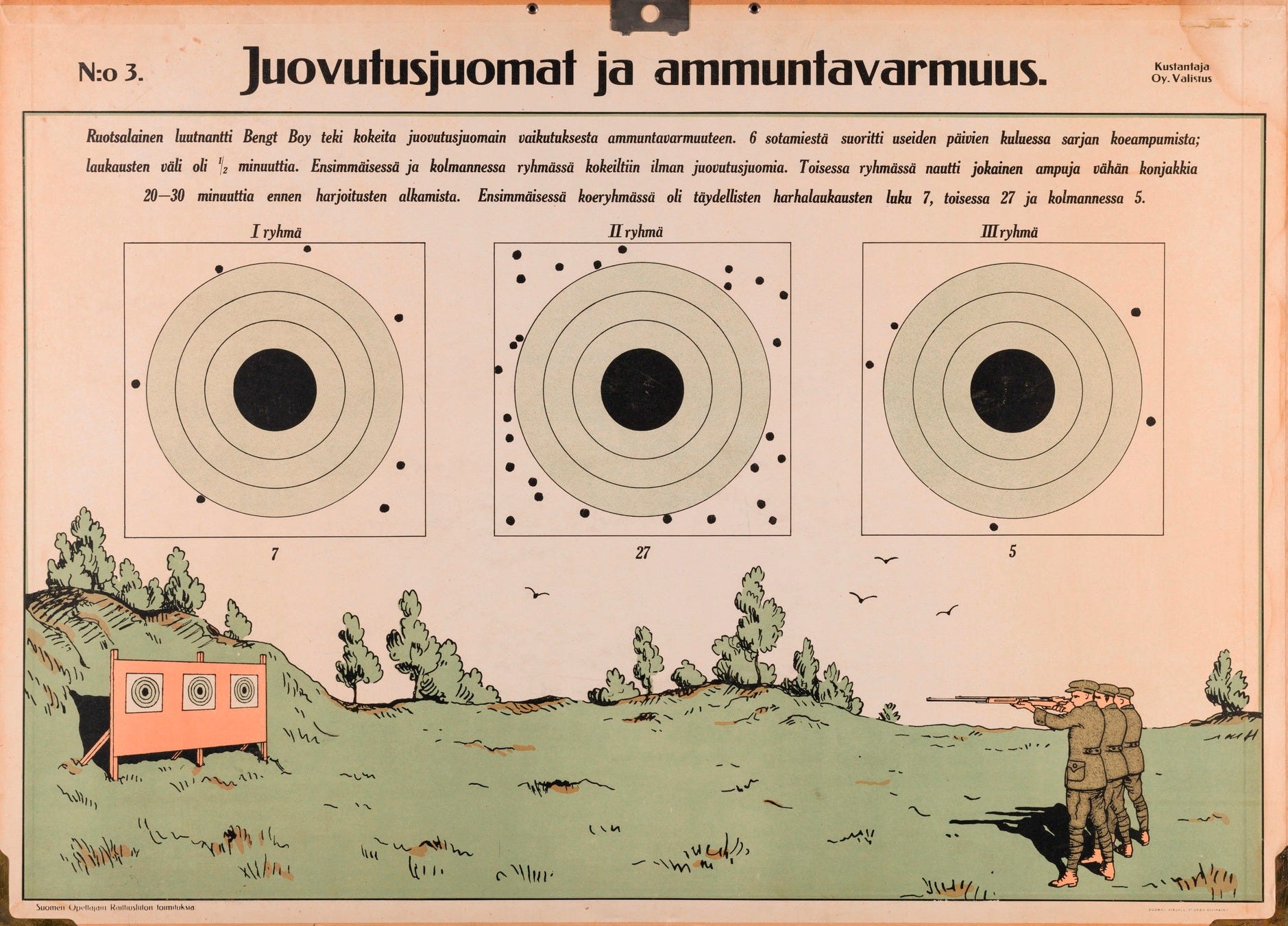 No 3. Intoxicating drinks and shoot accuracy. The board’s graphic illustrates the experiment of a Swedish lieutenant, Bengt Boy on the effects of alcohol on shooting accuracy. Six soldiers carried out a series of test shootings over the course of several days; the interval between shots was 30 seconds.In the first and third groups, the tests were conducted without intoxicating drinks. In the second group, each shooter drank a small amount of cognac 20–30 minutes before the exercises began.In the first test group, the number of perfect misses was 7, in the second 27, and in the third 5. Image courtesy of Helsinki City Museum.