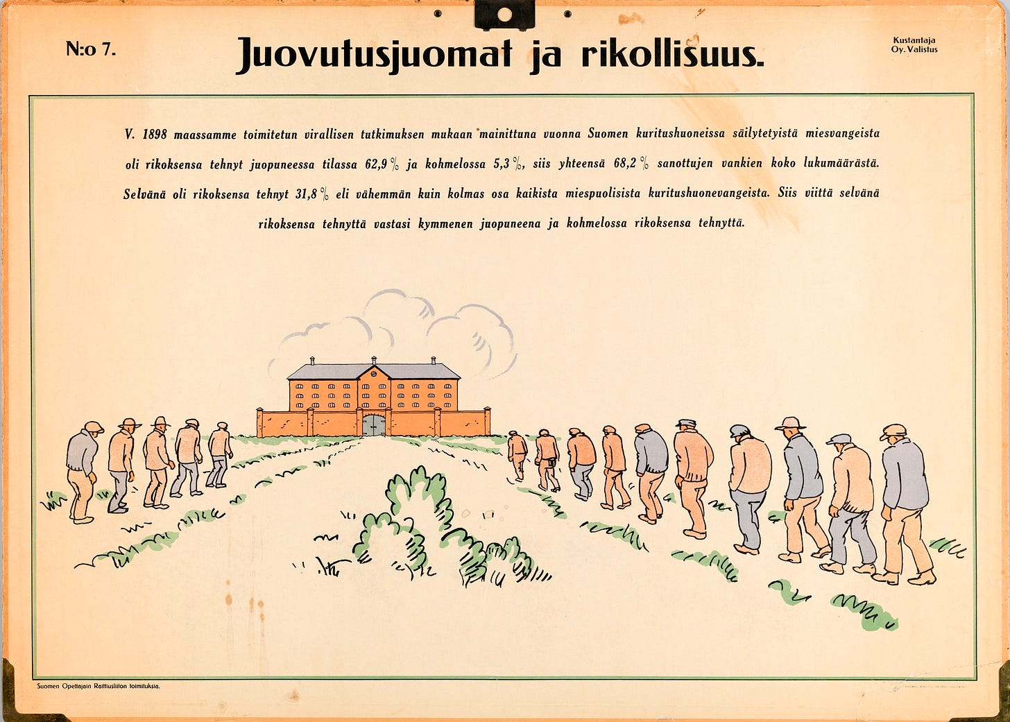 No. 7. Intoxicating drinks and criminality. According to an official study conducted in Finland in 1898, regarding male prisoners detained in Finnish penitentiaries that year: 62.9% had committed their crime in an intoxicated state and 5.3% while hungover; thus a total of 68.2% of the entire number of said prisoners. 31.8% had committed their crime while sober, or less than one-third of all male penitentiary prisoners. Therefore, every five men who committed their crime sober corresponded to ten who committed their crime while intoxicated or hungover. Image courtesy of Helsinki City Museum