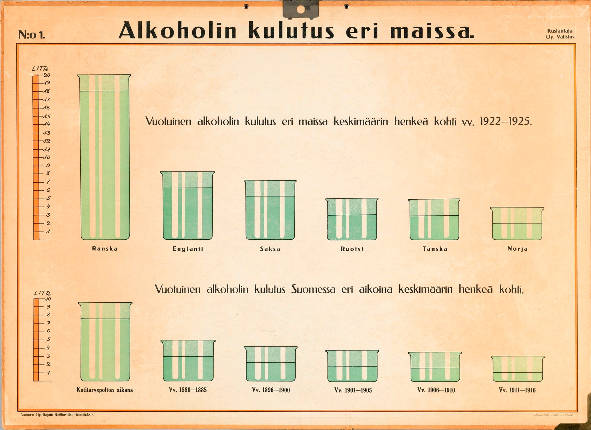 No 1. Alcohol consumption in different countries. The upper part shows annual alcohol consumption in different countries per person on average, in litres, 1922–1925. The lower part shows annual alcohol consumption in Finland at different times per person on average, in litres. Image courtesy of Helsinki City Museum.