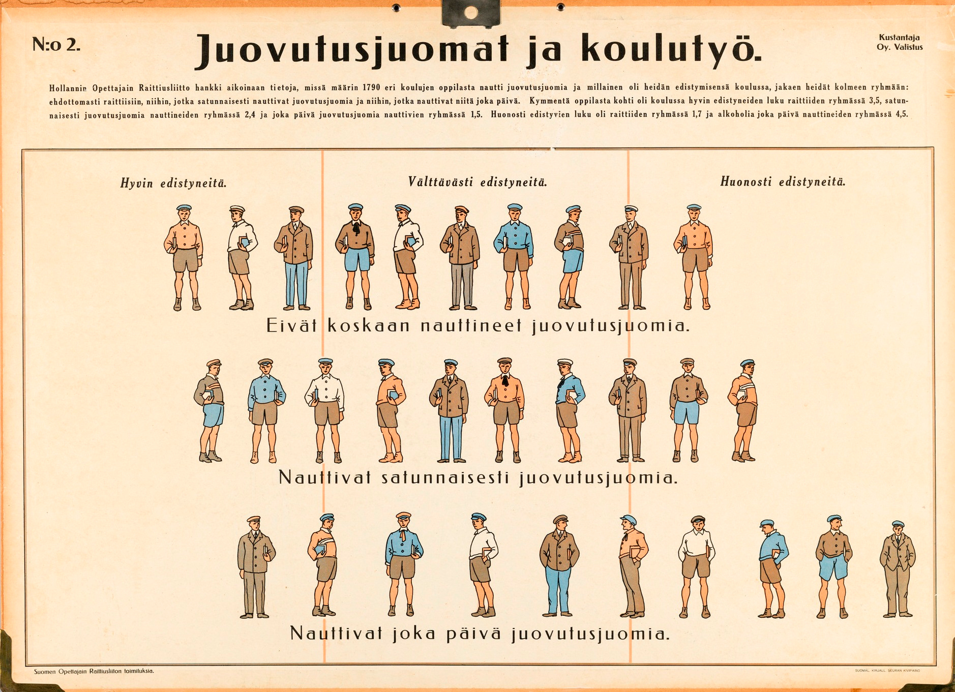 The series was created by Akseli (Axel) Eino Einola (1898–1948) in 1928. Einola was a relatively well-known graphic artist and illustrator who wrote numerous children’s books and created educational print series. The seven boards was commissioned by the Finnish Teachers’ Temperance Association, which has a rather amusing name. The publisher was the Osakeyhtiö (Oy) Valistus company. The series presented here is owned by the Helsinki City Museum.